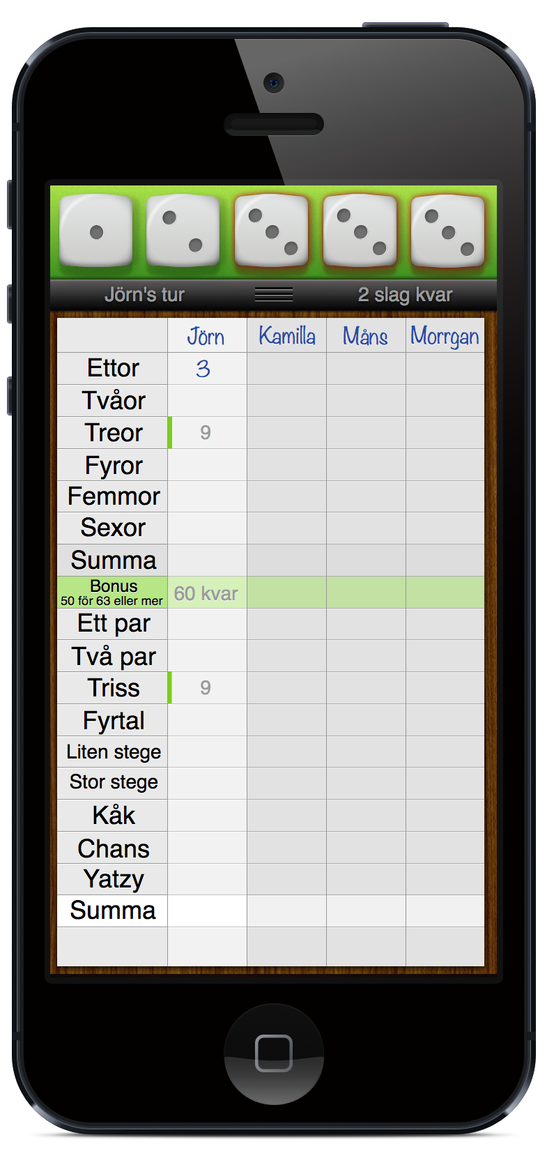 Dices that look like real dices. Drag the bar down to throw the dices and watch a fast and nice animation of the dices rolling around on a larger area.